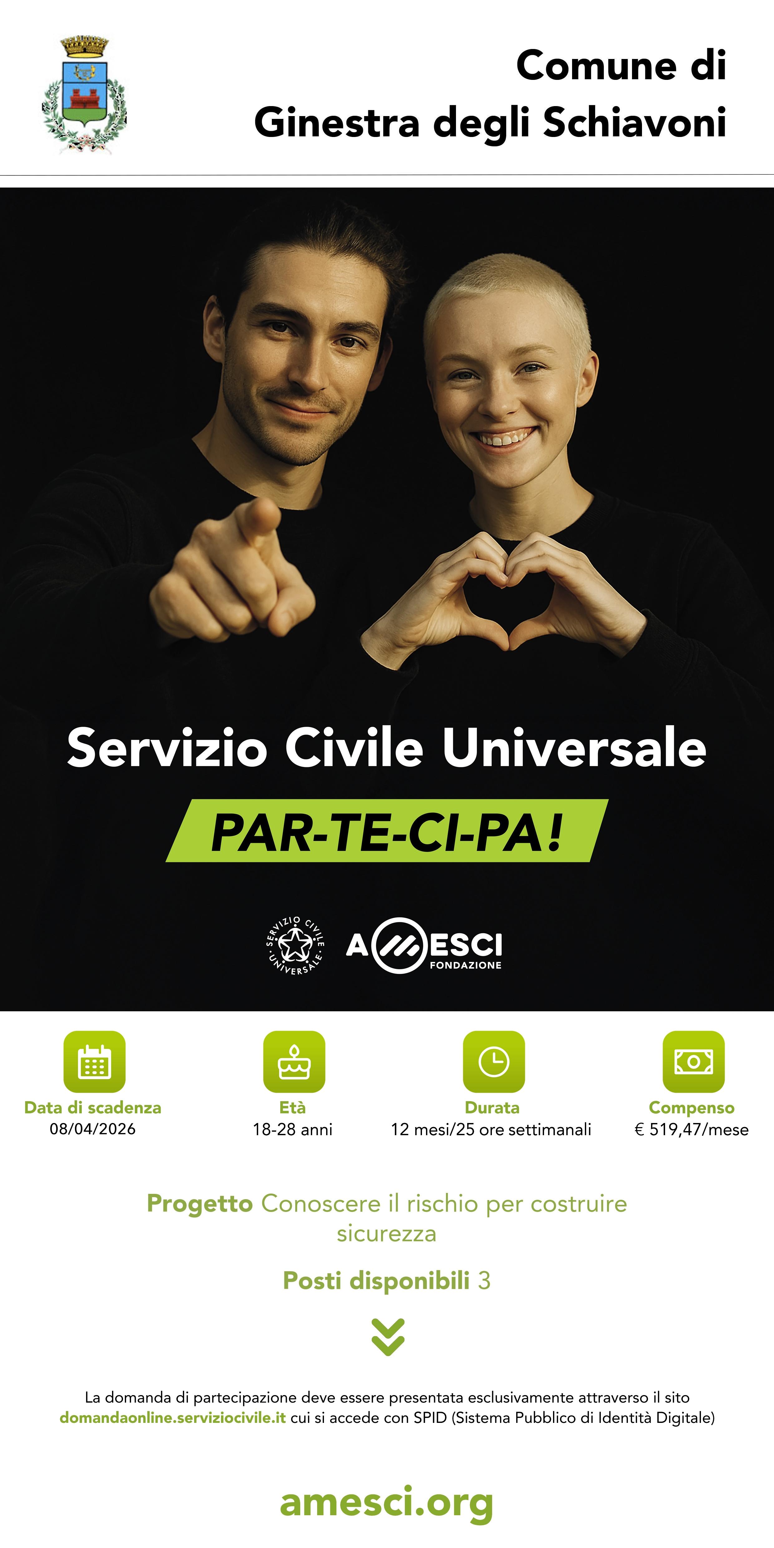 SERVIZIO CIVILE UNIVERSALE - ANNUALITA' 2025 - BANDO DI SELEZIONE VOLONTARI DA IMPIEGARE NEL PROGETTO "CONOSCERE IL RISCHIO PER COSTRUIRE SICUREZZA"